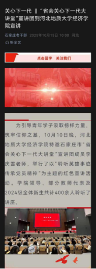 2025年10月15日,石家庄市委老干部局公众号“石家庄老干部”以“‘省会关心下一代大讲堂’宣讲团到河北地质大学经济学院宣讲”为题,对我院特邀宣讲团成员李庆雪举行“聆听英雄事迹,传承党员精神”为主题的宣讲活动进行了报道。