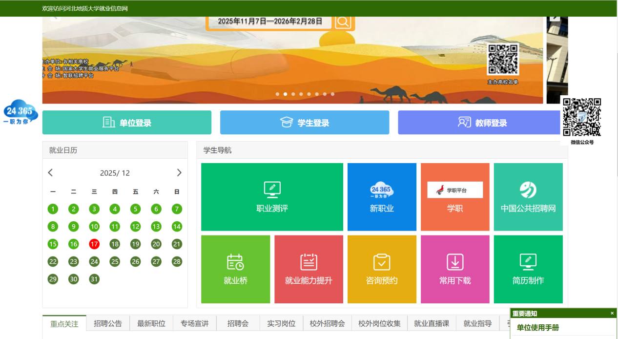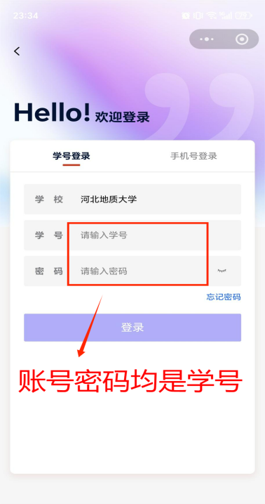 扫码关注就业星智涯小程序,或者搜索【就业星智涯】,需使用学号登录,学校选择“河北地质大学”,输入本人学号及密码即可完成登录,初始密码为本人学号。